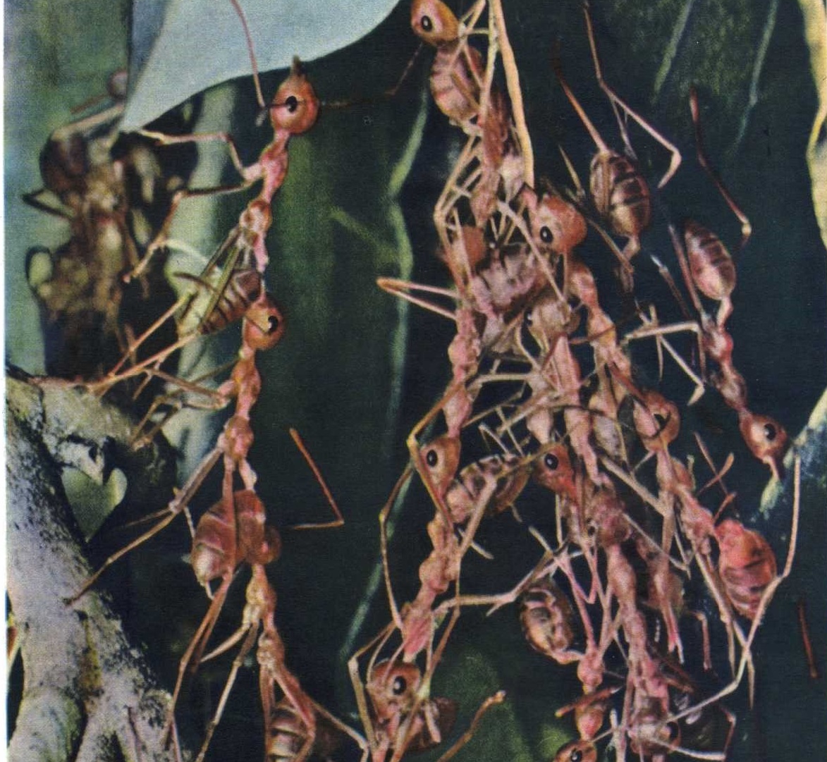 Иногда, если трудно схватить края листьев и сблизить их, сотни муравьев, держа друг друга ножками, связываются длинными цепочками. На одном дереве может быть около сотни отдельных гнезд величиной с футбольный мяч. Они сшиты из живых листьев, которые долго остаются зелеными, надежно скрывая гнездо от врагов.