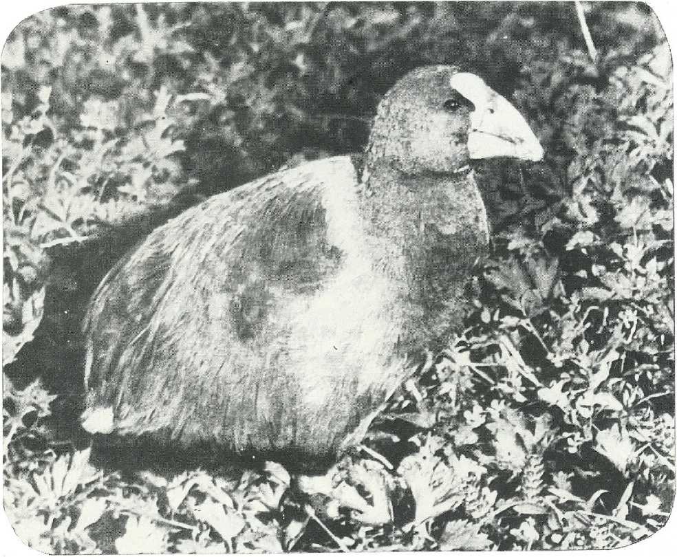 В 1847 году английский натуралист Уолтер Мэнтелл в устье реки Вэйн нашел какие-то птичьи кости. Он послал их в Лондон знамени­тому палеонтологу Ричарду Оуэну, который и сделал первое описание «вымершей» птицы. А через два года охотники на тюленей поймали живую такахе. Они никогда раньше не видели эту птицу и были пора­жены красотой ее оперения. Большой, массивный клюв и сильные ноги такахе ярко-красные. Голова и шея сине-черного цвета. Перья на груди и боках голубые, спина и крылья бирюзово-зеленые, переливающиеся, хвост синий, с металлическим отливом, а подхвостье белое. Размером она была с крупного петуха. Охотники поняли, что имеют дело с какой- то редкостной птицей. Продержав ее четыре дня и не зная, как посту­пить с ней дальше, они сочли наиболее правильным зажарить такахе и съесть. Правда, шкурка и скелет птицы сохранились и позже случай­но попали в руки Мэнтелла.